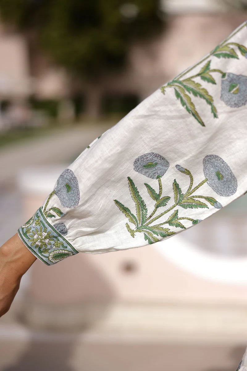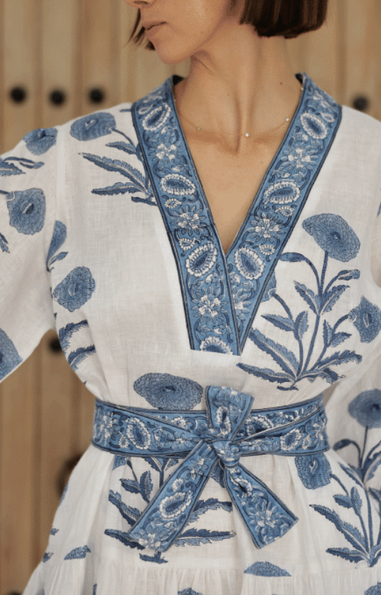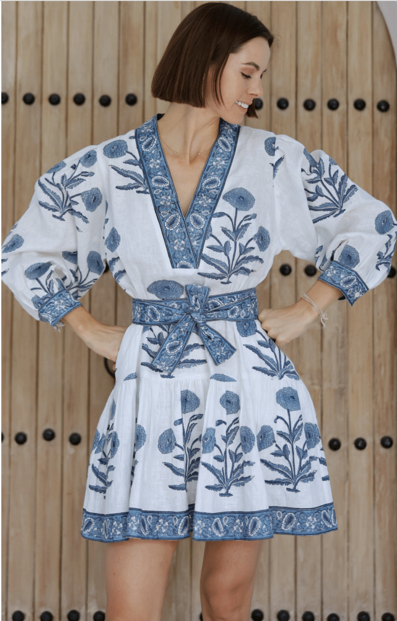 A mini version of our best selling Capri Maxi, our Mykonos Mini has an feminine and flirty silhouette. The dress is hand block printed on 100% European linen with a V-neck opening and matching optional belt. This dress features hidden side seam pockets and adjustable mother-of-pearl buttons at the wrists.