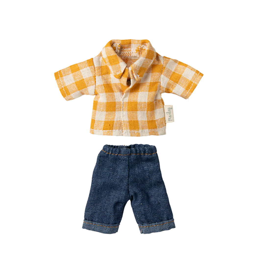 A classic Maileg item; Dad mouse in checked shirt and denim pants. This mouse fits furniture and accessories in size mouse. Buy more clothes separately. Clothes in size mum/dad fits this mouse.