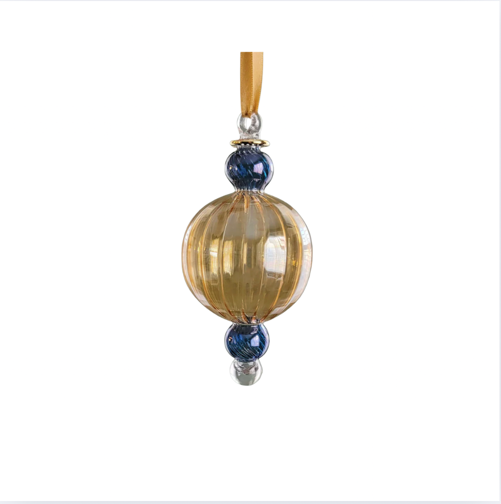 Handcrafted swirl ornament. Each swirl is a different color along with different color glass ball ends. This ornament if made out Egyptian hand blown glass with a 14K gold accents.