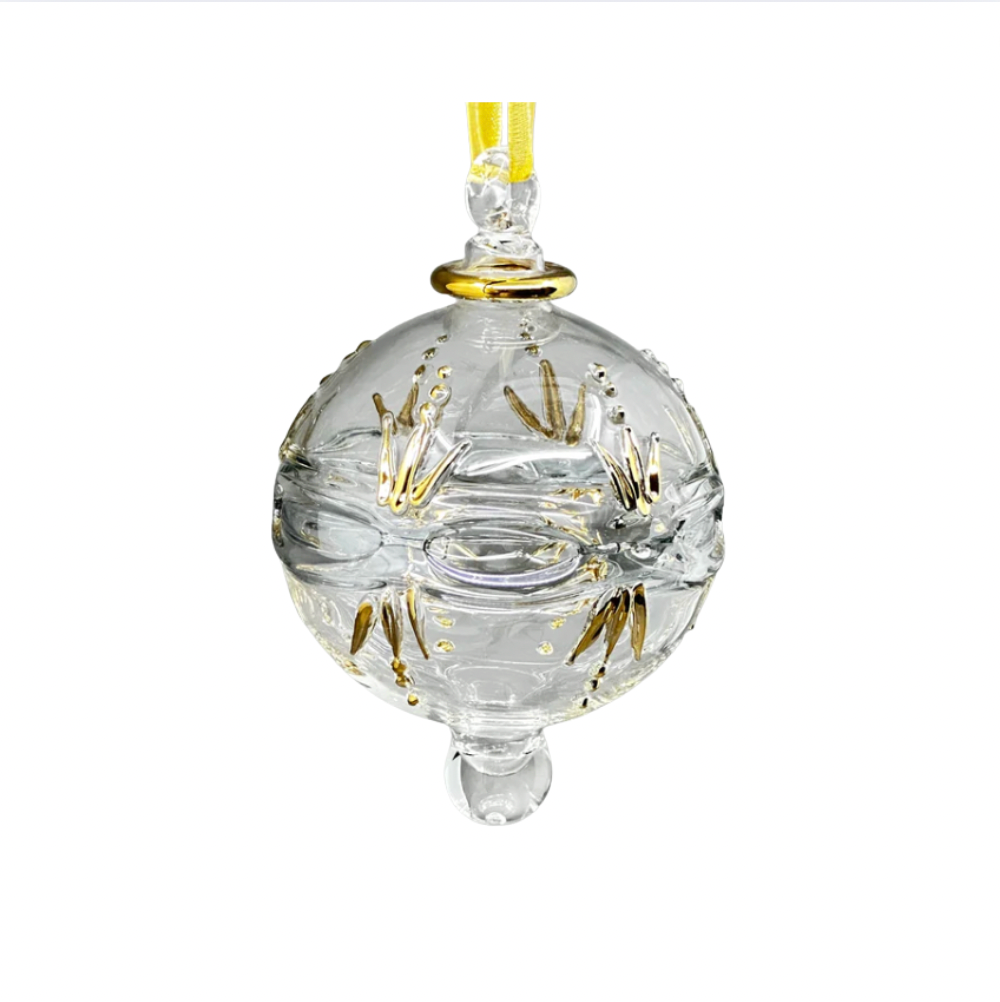 Egyptian Hand Blown Glass Handcrafted large globe ornament with a geometric design. Made out of hand blow glass with 14k gold accents. Array of colors to choose from.