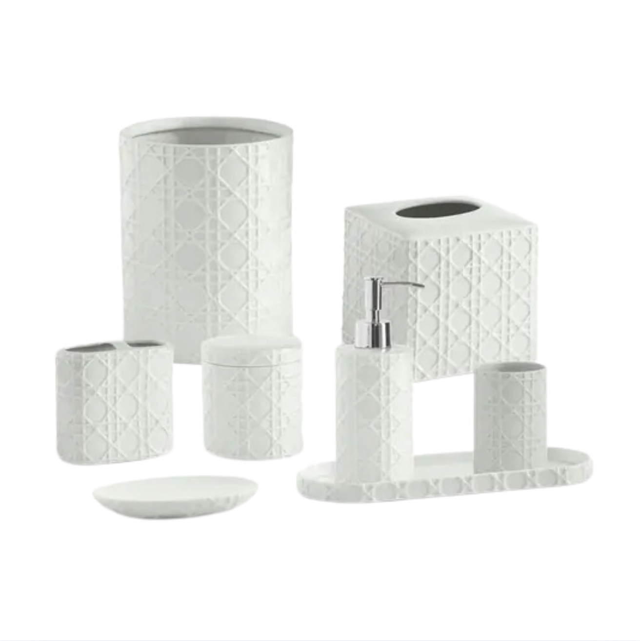 Crafted from fine embossed porcelain, each piece of our Rattan bath accessories collection combines simple contemporary design with the aesthetic appeal of woven rattan details.