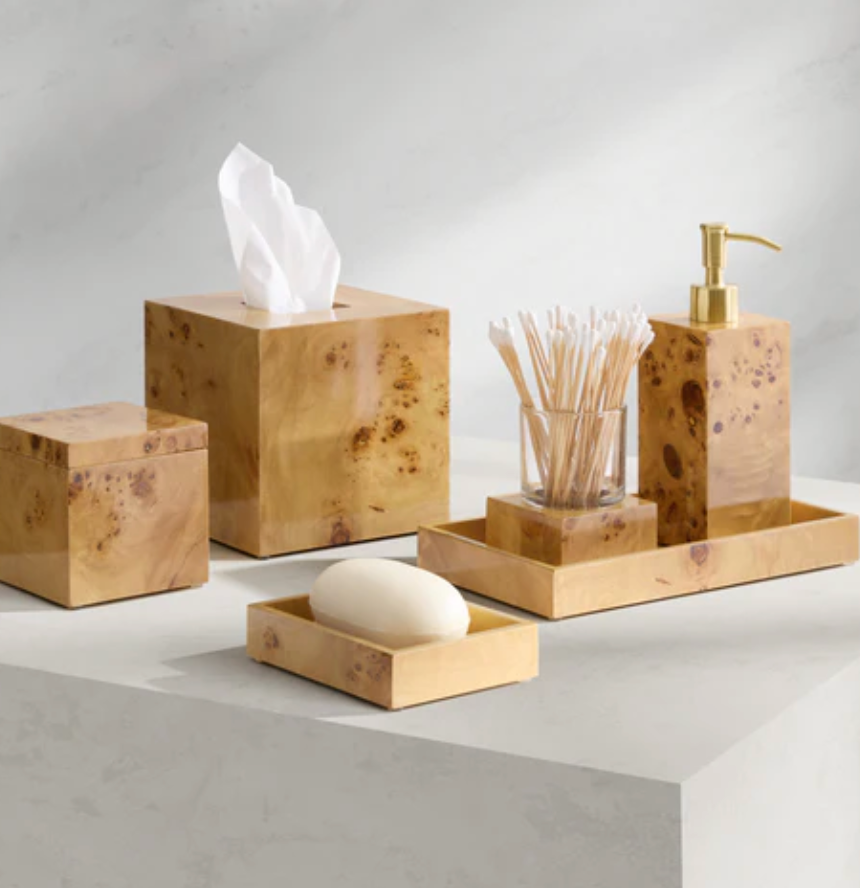 Welcome the beauty of nature into your home with our Mesa Bath Accessories. These timeless pieces are expertly crafted with honey-colored burl wood, giving each accessory a distinctive pattern and a rustic-meets-modern style that is sure to add warmth to your space.