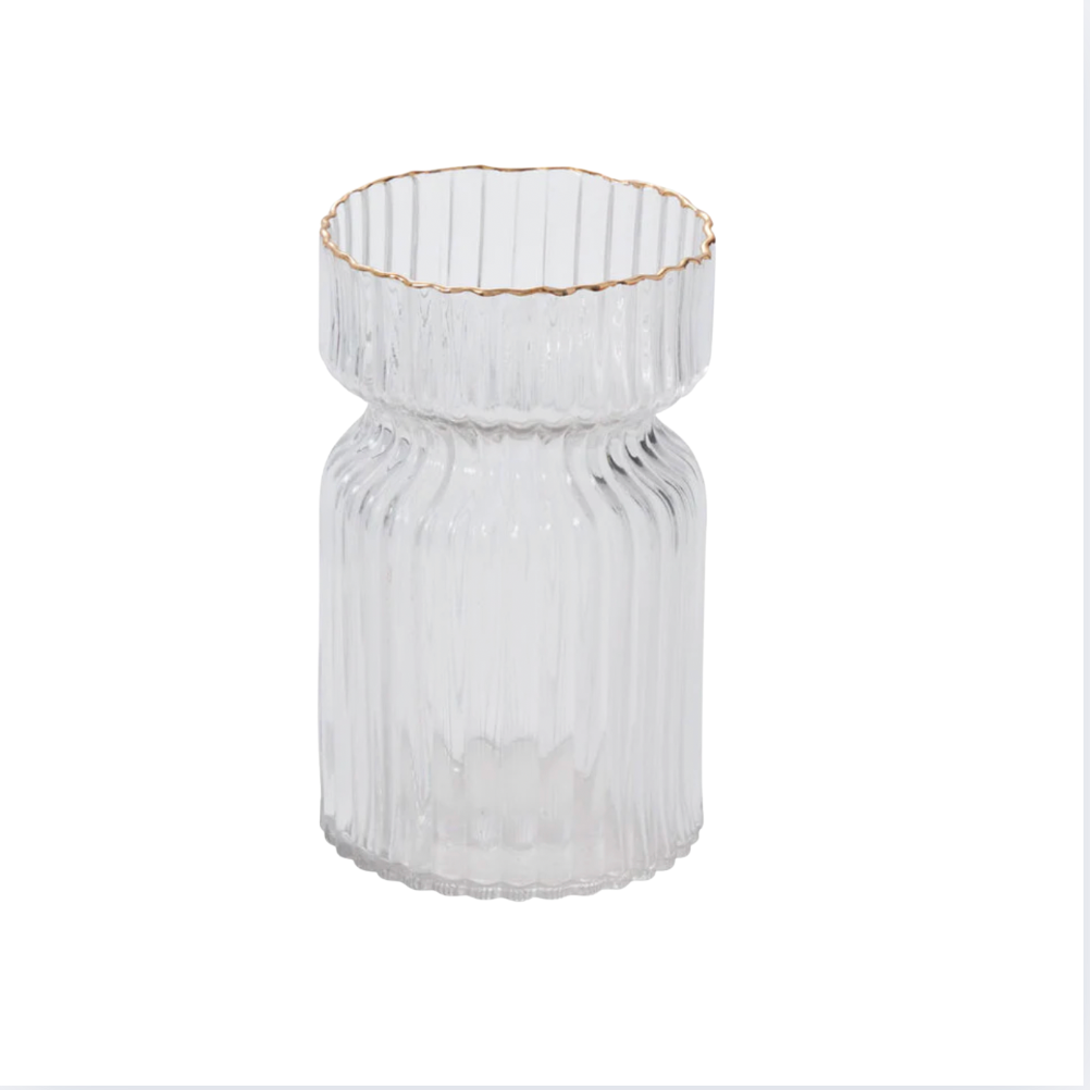 Set the table with elegance & sophistication with the glass Odette Vase, featuring a ribbed texture, cinched neck, & an exquisite gold metallic rim. Made from lightweight, textured glass, this cylindrical vase is a modern take on classic design that effortlessly complements everyday decor or special events.