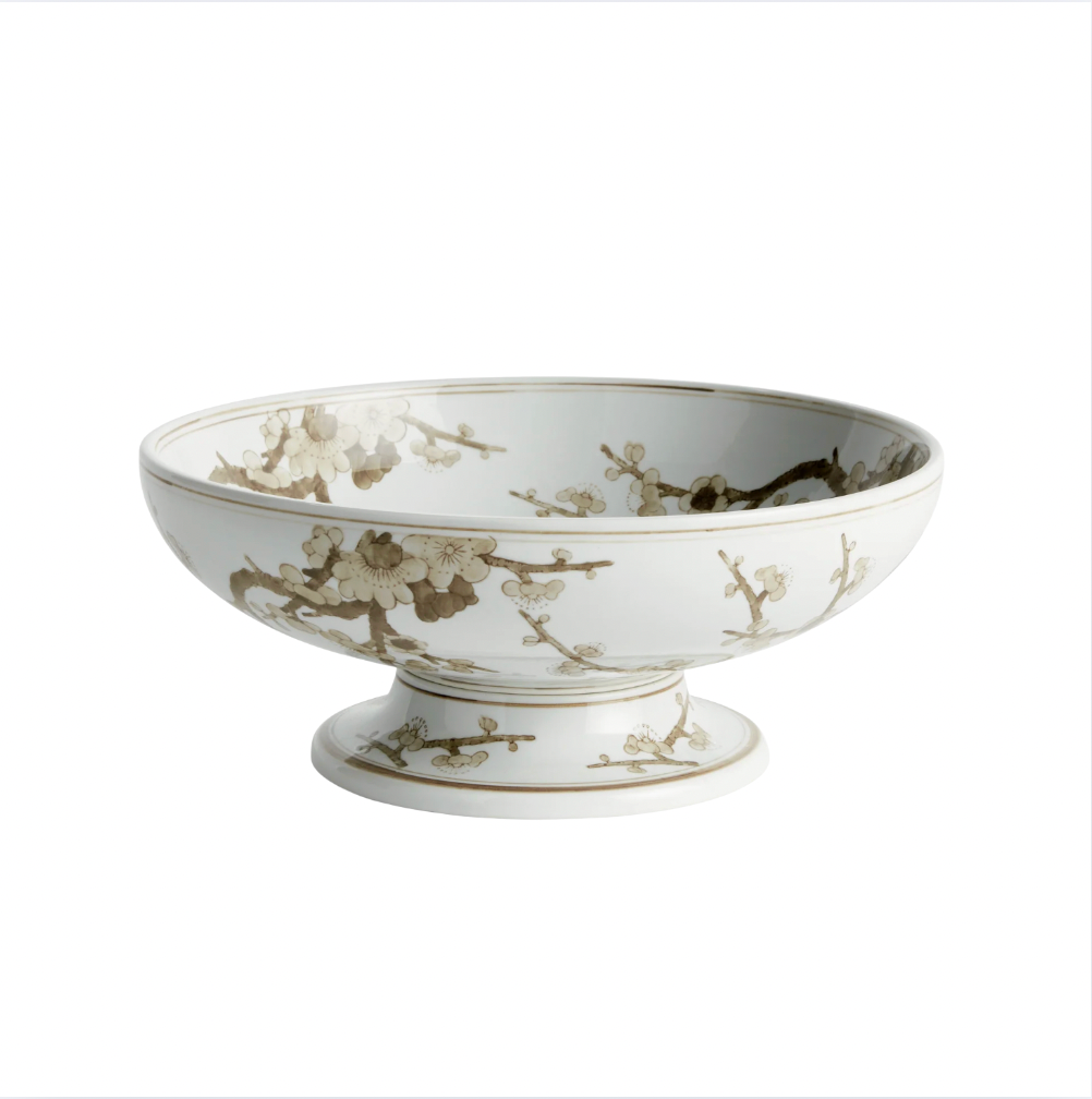 A classic chinoiserie pattern in taupe and white. In design, taupe is often associated with muted, sophisticated qualities. It evokes balance and timelessness. A tone that plays well in any palette, and is an inspired design choice for this elegant decorative footed bowl. A welcome addition to kitchen island, coffee table or mantel.