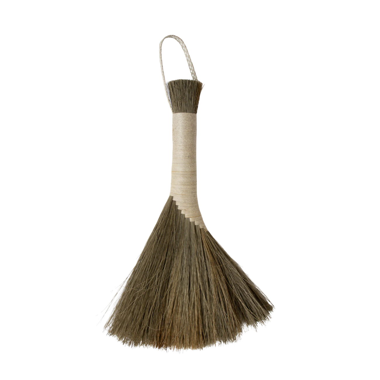 This is a softer sweep than the broomcorn brushes, and is perfect for tabletop, or light dusting. In house natural dyed tampico on the darker brushes and in house natural dyed leather cord on dark dyed brushes.
