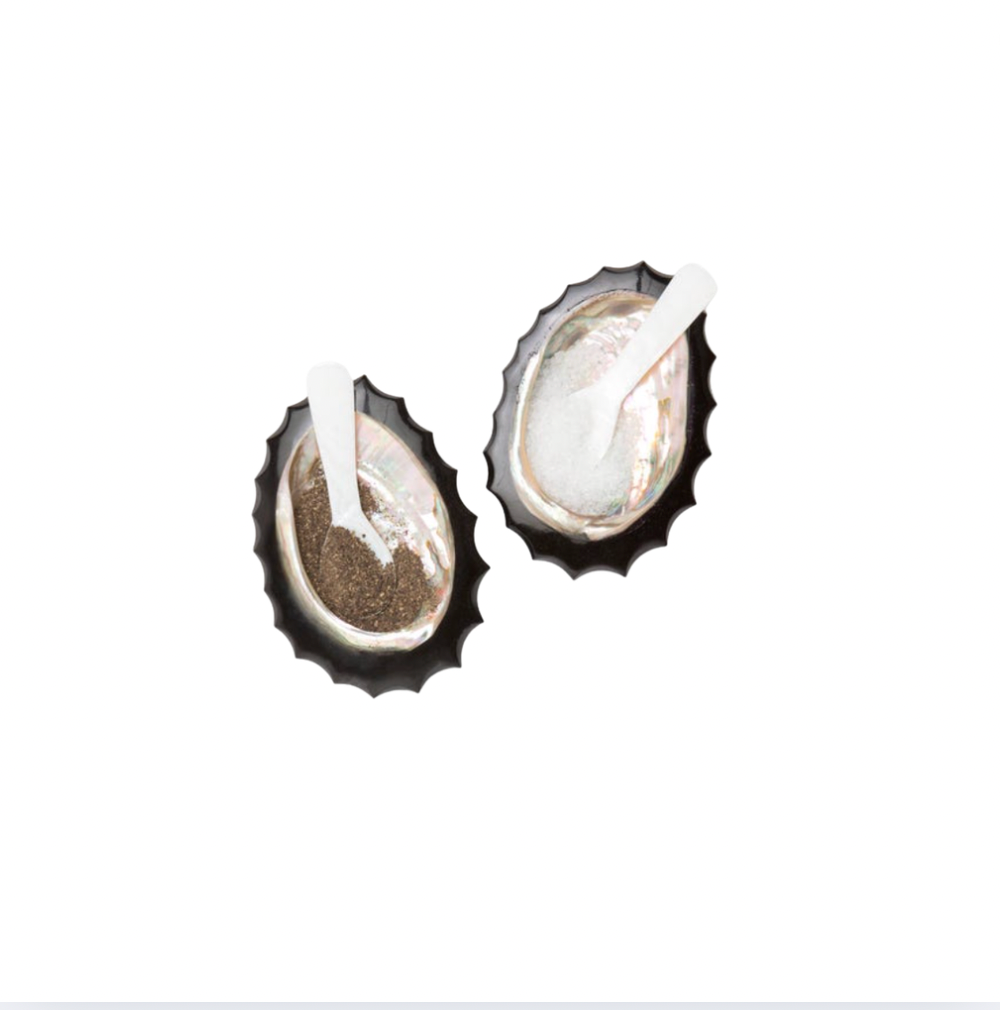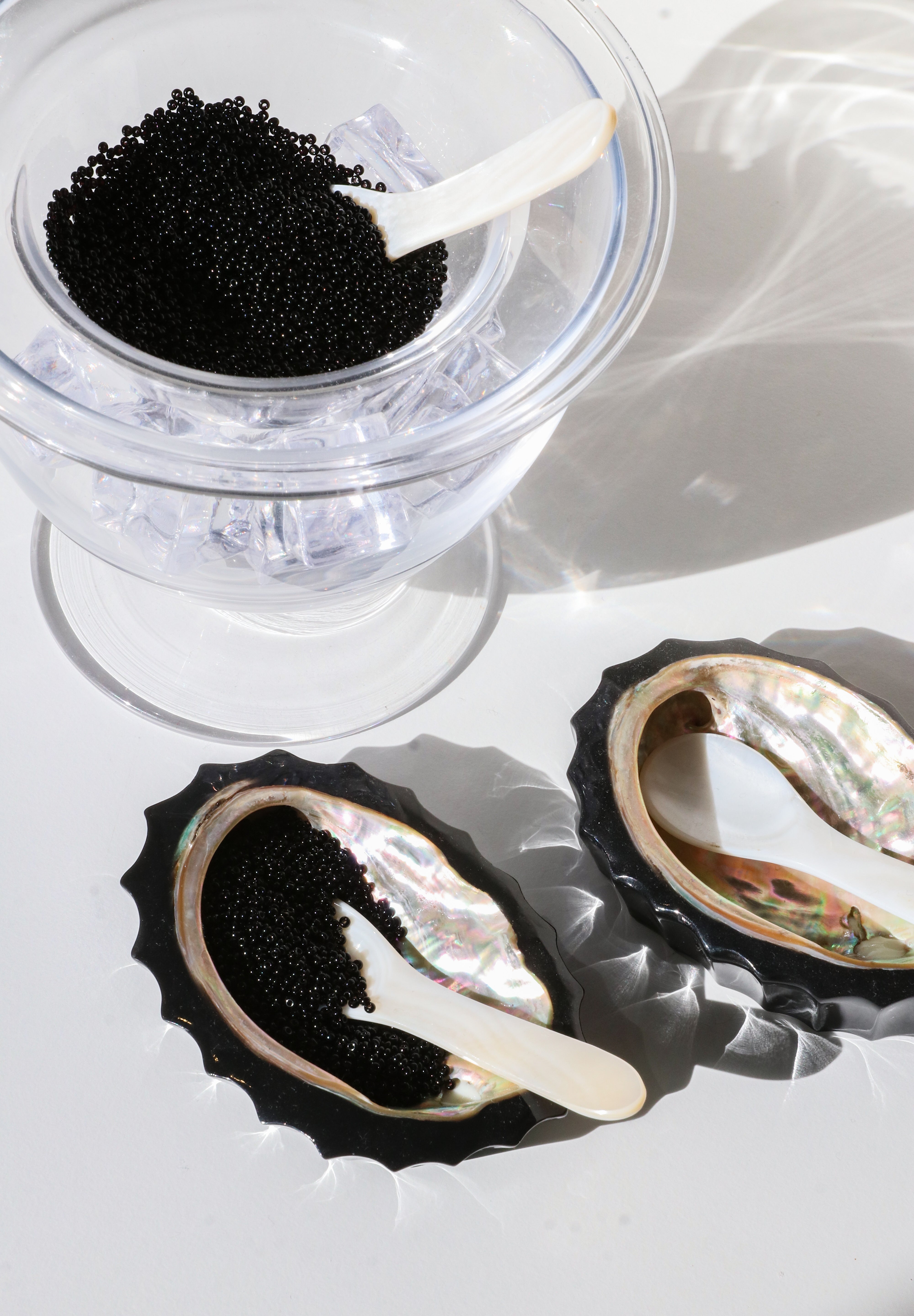 Abalone shell pinch bowls set in ridged black resin with miniature serving spoons. Natural variation to be expected.